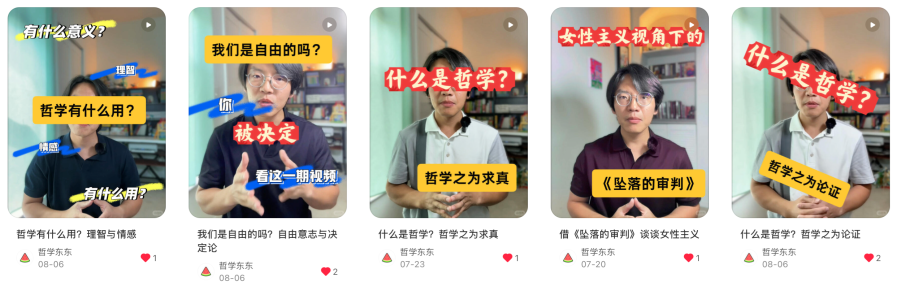 小红书@哲学东东 《哲学东东》开场白 什么是哲学?「哲学之为求真」 什么是哲学?「哲学之为论证」 什么是哲学?「哲学之为治疗」 哲学有什么用?理智与情感 借电影《坠落剖析》谈谈女性主义 我们是自由的吗?
